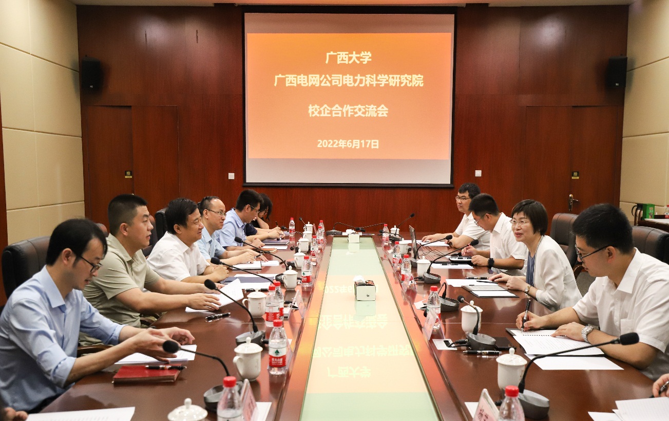 2022年6月17日上午,广西电网公司电力科学研究院总经理兼党委副书记周毅波,总工程师副总经理周柯等一行5人,到我校资源环境与材料学院邹炳锁院长、沈大强书记与开展合作洽谈。