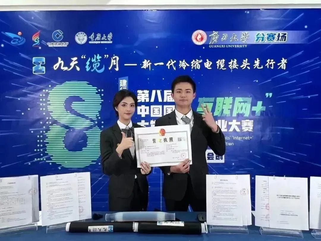 在第八届中国国际“互联网+”大学生创新创业大赛总决赛中,广西大学参赛项目《九天“缆”月——新一代冷缩电缆接头先行者》从201个高教主赛道本科生创意项目中脱颖而出,斩获金奖,实现了广西大学国内赛道金奖“零”的突破,刷新历史最佳成绩。