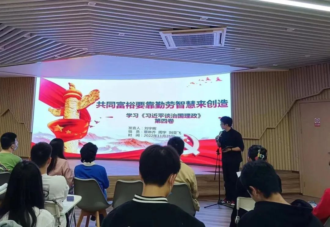 在深入学习党的二十大精神和《习近平谈治国理政》第四卷等重要内容后,各小组组员们结合自身学习生活经历进行了交流,并派出代表上台分享本组的学习心得体会。六组代表分享了对实现中华民族伟大复兴的中国梦、共同富裕要靠勤劳智慧来创造等方面的学习感悟,并联系自身的学习生活经历,围绕新发展理念、疫情防控、生态文明建设、实现共同富裕等热点话题进行交流,引发了全体成员的共鸣与深思。