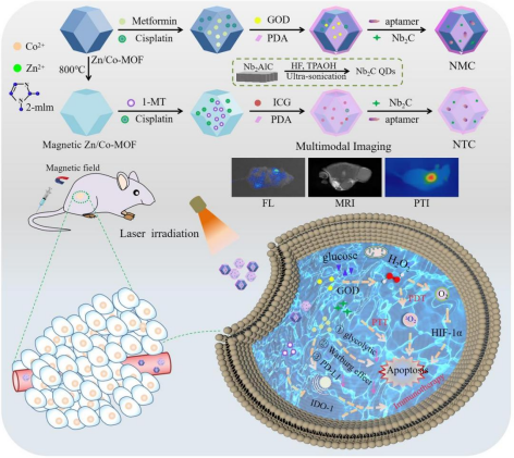基于光热/光动力学的治疗方法是一种新兴的肿瘤治疗策略。然而,由于肿瘤微环境的缺氧、内源性H2O2水平低等特性,肿瘤的治疗效果并不明显。本文开发了一种多重抗肿瘤纳米反应器,由双金属有机框架(Zn/Co-MOF)、二甲双胍、顺铂、吲哚菁绿(ICG)、1-甲基色氨酸(1-MT)和Mxene制备。构建的纳米反应器通过适配体和磁效应靶向肿瘤细胞。在肿瘤微环境中,NMC可高效消耗内源性葡萄糖,通过GOD介导的糖代谢反应产生H2O2和葡萄糖酸,诱导肿瘤的“饥饿”治疗。反应生成O2和1O2,可以有效改善肿瘤的缺氧环境,降低对PDT的耐药性。释放的二甲双胍可阻断糖酵解反应,导致细胞凋亡,并可以通过内质网相关的PD-L1降解逆转肿瘤免疫抑制从而增强免疫反应。同时,二甲双胍也可阻碍氧气消耗并提高氧气含量以提高GOD的催化效率。在激光照射下,温度在肿瘤部位急剧增加,Nb2C和ICG可以产生光热效应,这可以导致肿瘤细胞凋亡,达到显著的PTT效应。数据显示,联合使用NMC和NTC可以触发免疫反应,产生有效的免疫治疗效应。