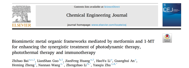 论文引用:Z.H. Bai, L.S. Guo, J.F. Huang, H.Y. Li, G.H An, H.M. Zheng, N.N. Wang, Z.Z Li, Y.Q. Zhu. Biomimetic metal organic frameworks mediated by metformin and 1-MT for enhancing the synergistic treatment of photodynamic therapy, photothermal therapy and immunotherapy. Chemical Engineering, 479 (2024) 147932.