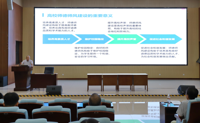 学院党委副书记、常务副院长冯庆革作了题为《加强和改进高校师德师风建设》的专题教育,强调要提高思想认识,自觉践行师德规范,以德施教、以德育人,严守师德师风底线红线。