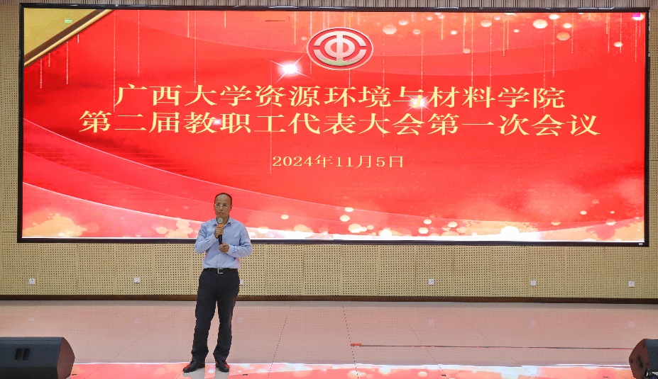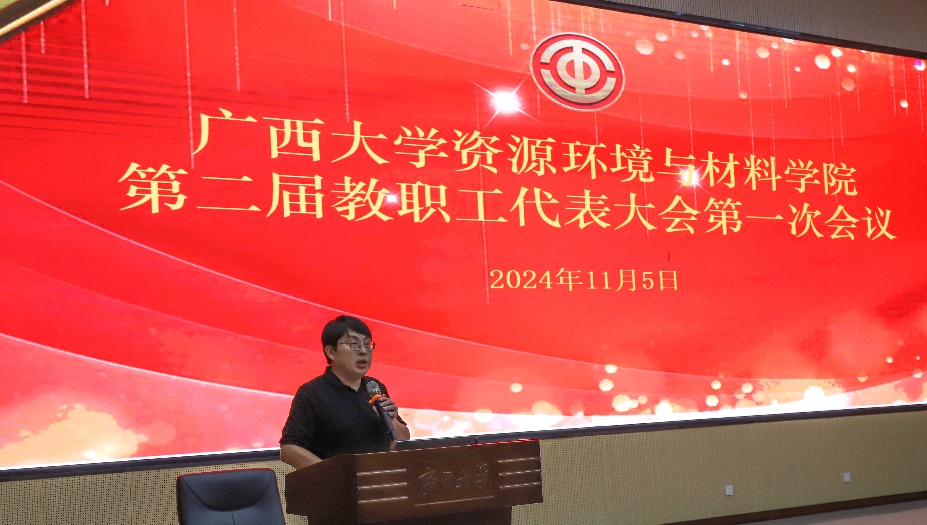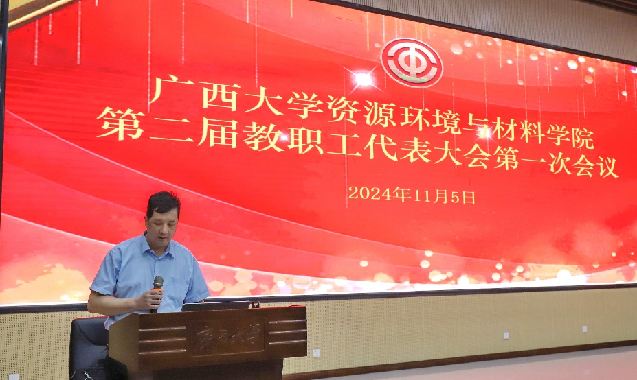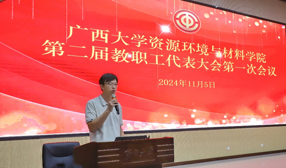 大会在嘹亮的国歌声中开幕。代表们听取、审议并表决通过了《广西大学资源环境与材料学院教职工代表大会制度》,同意了因人事安排变动的分工会负责人调整方案,增补选举刘易同志担任学院分工会主席。会上,学院副院长刘易对2024年学院奖励性绩效分配情况作了说明,对做好年度绩效总结、统计工作进行布置。