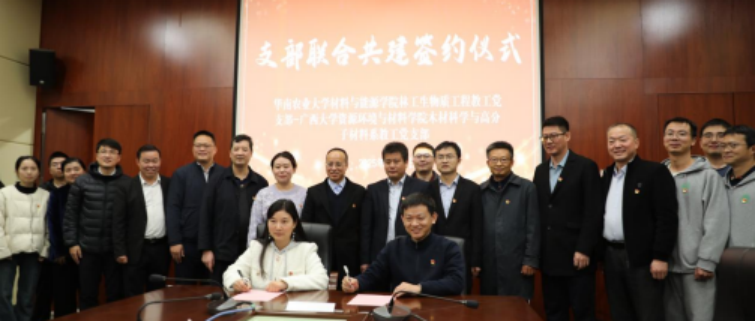 1月12日,华南农业大学材料与能源学院党委书记魏剑波一行,到我院开展党建交流活动,院党委书记沈大强组织座谈交流,华南农业大学材料与能源学院林工生物质工程教工党支部与广西大学资源环境与材料学院木材科学与高分子材料系教工党支部共签党建联合共建协议。