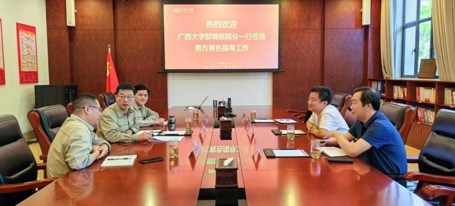 在华锡集团总部拜会时,与广西华锡集团股份有限公司副总经理韦方景、科发部部长许大洪等领导开展了系统深入交流,并就利用好广西的自然资源优势、面向东盟的区位优势等有利条件,探讨共建有色金属领域科研创新平台,就合作的目标、内涵、科研发展方向等细节进行了深入讨论,达成双方优势共享、合作共赢一致意见,将致力于共同推动高水平实验平台的建设发展,为广西产业升级发展贡献力量。