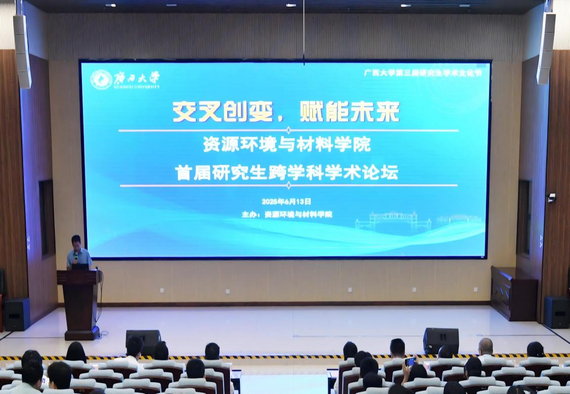 6月13日,资源环境与材料学院首届跨学科学术论坛在资环材大楼123报告厅隆重召开。本次论坛的主题是“交叉创变,赋能未来”,目的是推动学科交叉融合,及营造浓厚学术氛围,以及搭建高校研究生学术交流平台。论坛特邀清华大学、中南大学、华南理工大学、西北工业大学、华东理工大学、中南林业科技大学、桂林理工大学等国内知名高校的13名校外知名学者和硕博士研究生共同参与。本次论坛是在“广西大学第三届研究生学术文化节”总体框架下,由广西大学研究生院、校团委、学生工作部(处)联合主办,我院承办的盛会。