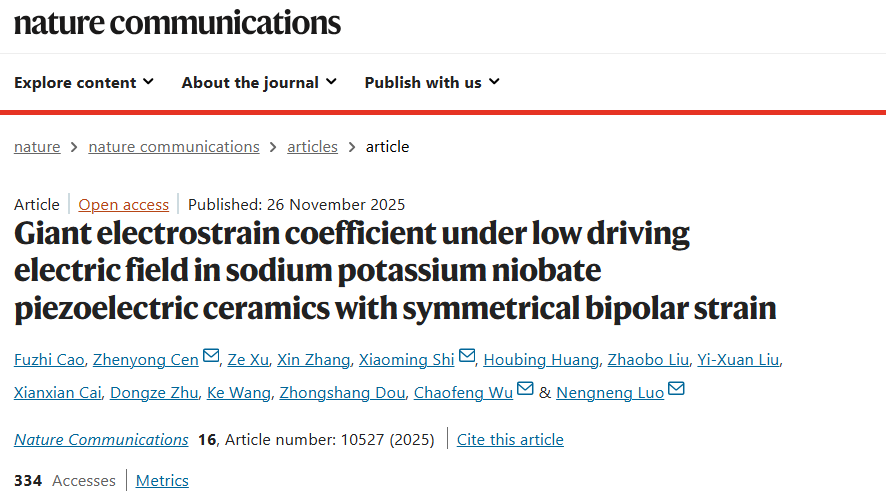 近日,我院科研团队研发出具备超低驱动电场和巨应变系数的铌酸钾钠无铅压电材料,性能超越当前主流的铅基压电体系,在高精度微型器件应用领域上展现出巨大的潜力。该成果以 “Giant electrostrain coefficient under low driving electric field in sodium potassium niobate piezoelectric ceramics with symmetrical bipolar strain”为题,发表在国际知名期刊《自然·通讯》(Nature Communications, 2025, 16, 10527.)上。广西大学为第一单位,资源环境与材料学院已毕业硕士研究生曹富植(目前为西北工业大学博士研究生)和岑侦勇副教授为共同一作。值得注意的是,这是我校硕士研究生首次以第一作者在Nature Communications发表论文。我校罗能能教授、岑侦勇副教授,北京科技大学施小明博士,浙江清华长三角研究院吴超峰博士为论文的共同通讯作者。清华大学王轲教授、徐泽博士,北京理工大学黄厚兵教授等人为论文提供了重要支持。