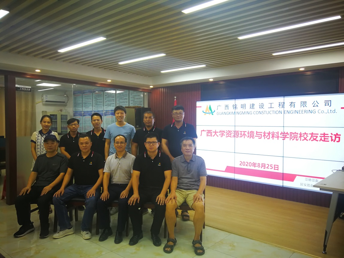 2020年8月25日,资源环境与材料学院党委沈大强书记带队,吴达慧副书记、吴仲雄教授、谭海文副教授、王纪坤老师前往南宁市武鸣区,到校友企业—广西铭明建设工程有限公司考察调研,同时为我院“校友兼职辅导员”该公司董事长钟芳杰颁发聘书。