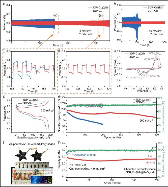 新兴的可穿戴或植入式电子设备是传感、监测和治疗的强大互动平台,这需要具有可定制尺寸和几何形状的高性能电池。与其他电池系统相比,水系锌离子电池具有优异的生物相容性,不涉及重金属和氟化物等对人体有毒的元素,是最合适的电池系统。然而,其锌枝晶生长和析氢反应会造成电池内部短路、库伦效率低和循环寿命缩短。据此,石绍宏老师团队利用3D打印增材制造技术和化学沉积相结合,开发了一种具有可定制几何形状的轻质三维铜结构,提供了与商业泡沫铜相当的导电性,并减少约80%的铜用量。同时采用亲锌石墨烯涂层促进锌在三维铜表面均匀且优先Zn(002)晶面生长,大大抑制了析氢反应。负载锌的三维电极可使对称电池在10 mA cm-2下稳定循环300小时,比累积容量达到 86.7 Ah g-1,表现出优异循环稳定性、高充电率和轻量化电极特征。全3D打印的袋式全电池(3.6 mAh)在1C下循环200次后,仍显示出91.4%的容量保持率,充分体现了其在新型电池的适用性。该研究不论从电池结构设计的自由度还是其性能表现,均为开发轻质集流体和可定制、高能量的水系锌离子电池提供了创新思路。