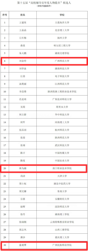 另外,在本次评选活动中,广西师范大学美术学院专职辅导员刘金玲、南宁职业技术学院智能制造学院专职学生辅导员林为湘、广西民族师范学院教育科学学院辅导员蓝观覃三人获全国“高校辅导员年度人物提名”称号。